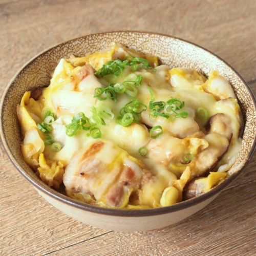 - 鶏むね肉とダシ調味料を加え、レンジで600Wで4分加熱する。