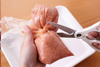 真ん中から袋の左右をねじって半分に分け、ねじった部分をキッチンばさみで切ると、肉ダネが簡単に2等分にして取り出せます。