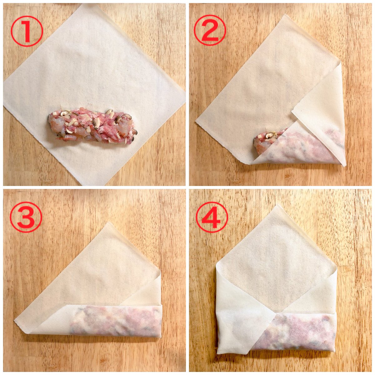 - 春巻の皮に具材を乗せマヨネーズをかけ皮を巻きます。まき終わりはマヨネーズで張付けます。
